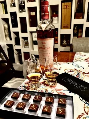 All of that is my prelude to saying the box that showed up from the Macallan last month is pretty spectacular even by my jaded standards. It was made in a limited edition of 300 to celebrate the debut of their new Harmony Collection, a new series of whiskies which, it says in the gorgeous wooden box in which it came, “shines a spotlight on the Macallan’s sustainability journey and intrinsic connection to nature.” Um, OK! The first single malt in the series, Rich Cacao, is meant to pair with chocolate, and as important as I consider sustainability, that’s the part of the equation that really got my blood pumping. To sweeten the deal (pun intended), they included a box of chocolates from the fancy-shmancy California-based chocolatier Compartés specifically designed to pair with the whisky.